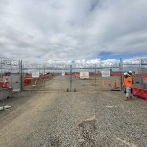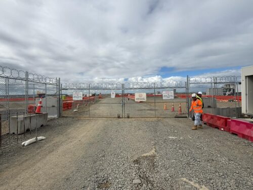 Rolls of razor wire top each temporary fence planel creating a no-climb barrier when placed together.