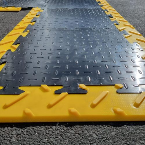 Plywood is commonly used for ground protection, but is not durable under heavy traffic conditions and quickly looses usefulness when exposed to wet environments.